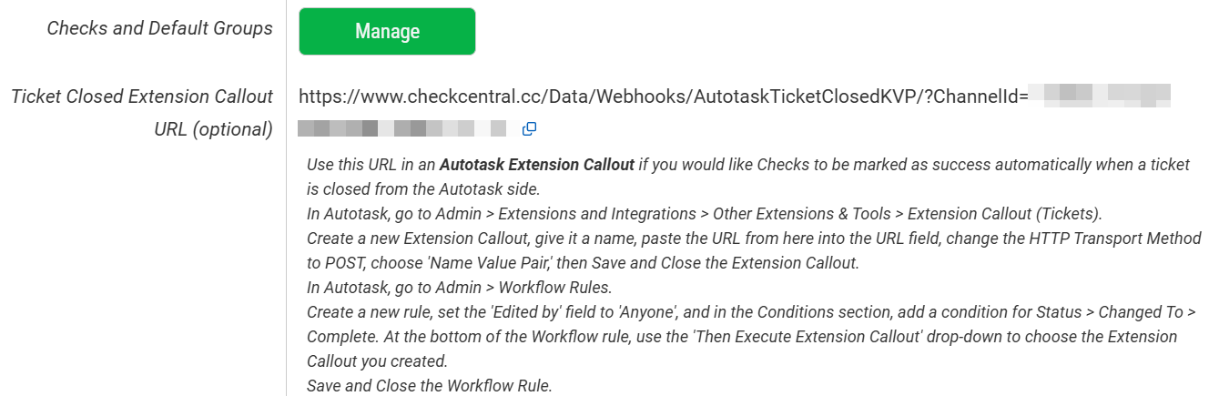 In CheckCentral, you can view the URL you'll need, plus the instructions on how to configure Autotask, at the bottom of the configuration dialog for the Autotask ticketing channel: