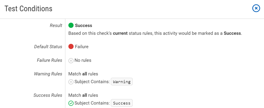 We're excited to announce a new feature to provide more information about the status of your checks: when viewing an activity, the new "Test Status Rules" button will open a dialog displaying the current status rules for the matched check.