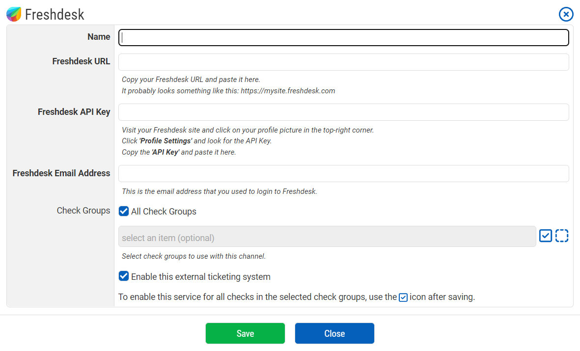 We're pleased to announce that we've added Freshdesk as an external ticketing system for your CheckCentral notifications! To get started with it, login to your CheckCentral dashboard, then click Notifications > External Ticketing Systems. From there you can add it as a new channel and detailed instructions are in the configuration window.