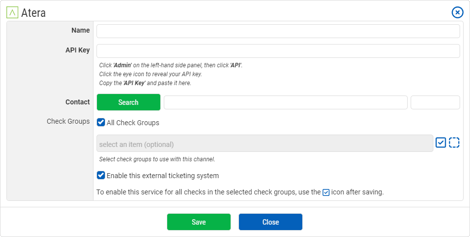 We're pleased to announce that we've added Atera as an external ticketing system for your CheckCentral notifications! To get started with it, login to your CheckCentral dashboard, then click Notifications > External Ticketing Systems. From there you can add it as a new channel and detailed instructions are in the configuration window.